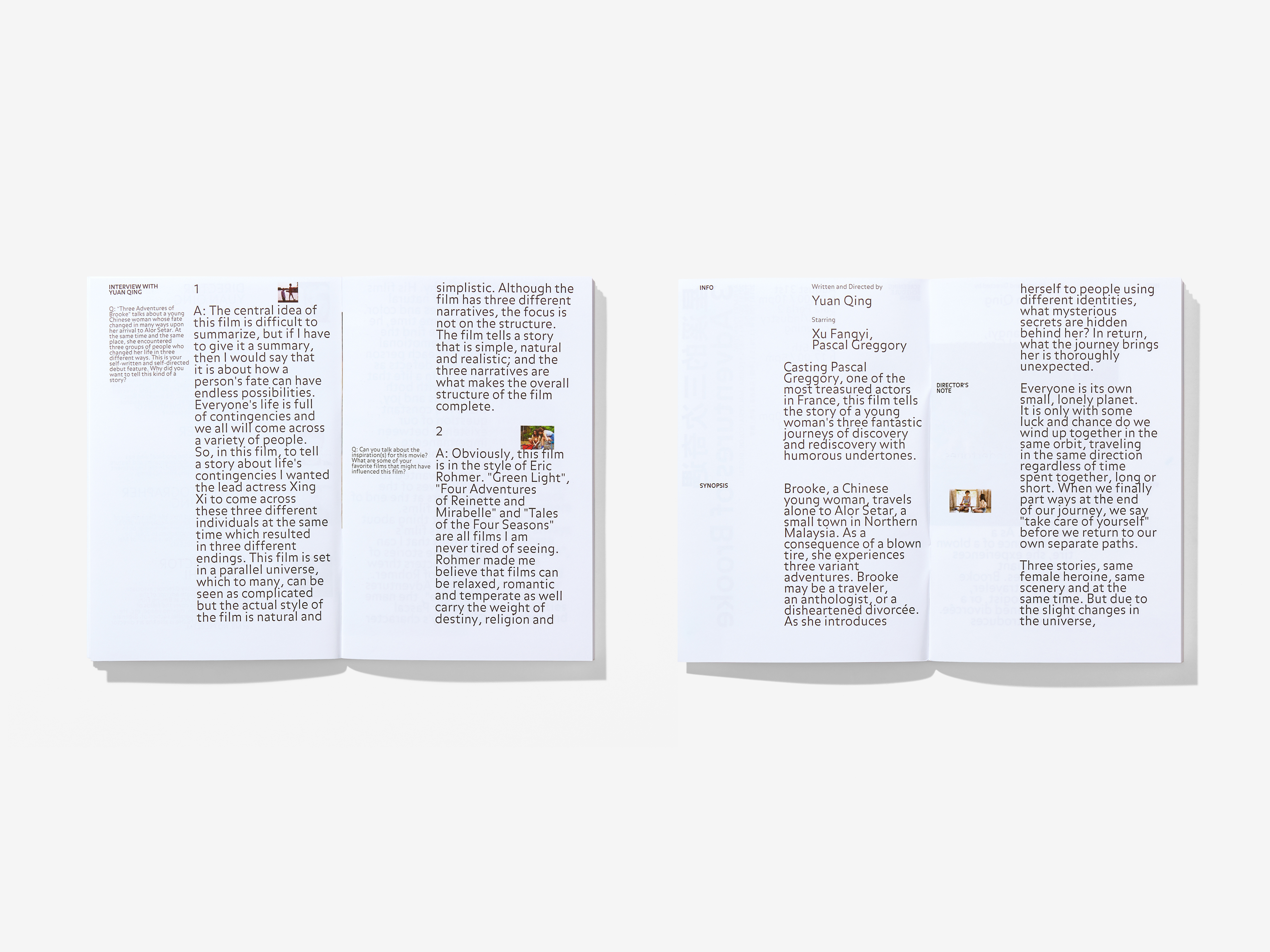 这是一部典型的新浪潮电影,基调轻盈、柔软、幽默。通过一个女孩的视角,展开对奇妙世界的探索。在宣传册的设计中,同样的内容反复出现,产生了记忆上的错综迷离,同时被图片遮盖的部分文字,使影像与叙事的关系变得暧昧。