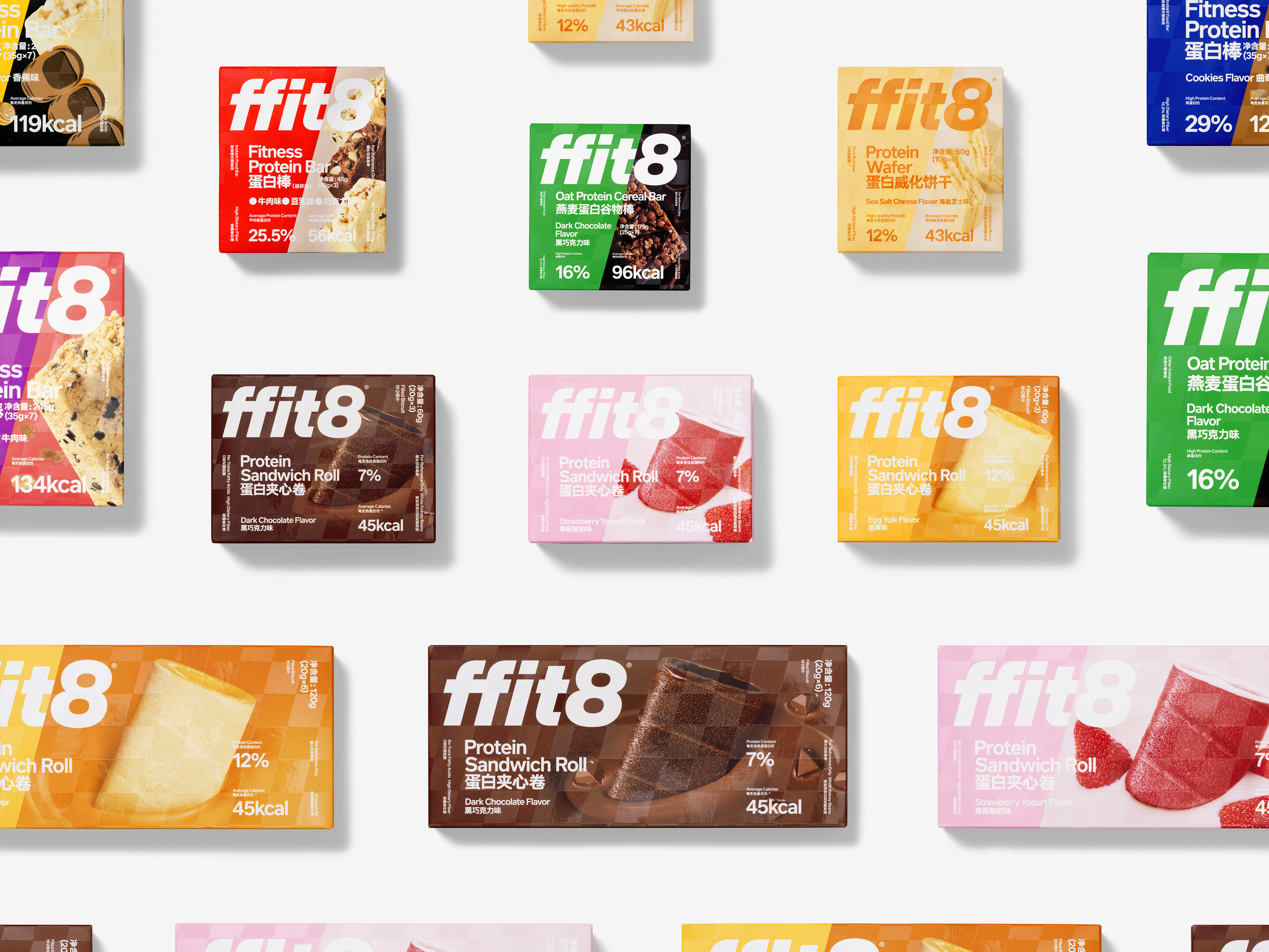 Consequently, we categorize ffit8’s core user group as an elite urban population with a relentless pursuit of health and fitness, and we are trying to alternatively describe this group: they are all people who are running by themselves. In light of this, we determined that the most effective visual language to convey the revolutionary spirit of aggression that should be associated with the ffit8 brand is speed. We designed the ffit8 logo with a slight tilt forward to bring the concept of being in motion into the brand. At the same time, we added a dark pattern system to the package design. A layer of flags comprised of light and dark grids will encircle the ffit8 product packaging. These flags resemble those seen after a racetrack and represent speed, passion, and pursuit. We deemed it appropriate to reflect the mindset of “those who run alone”!